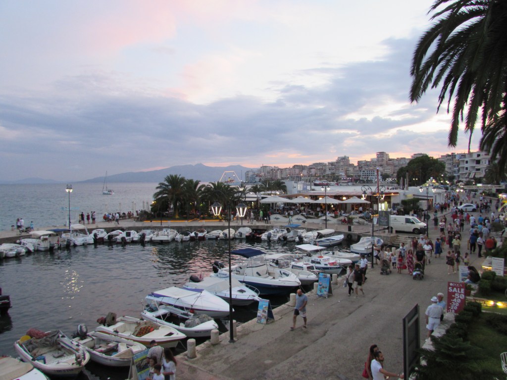 V Sarande je prístav (oficiálny, pre veľké lode, vzadu) a taký mini, pre malé lode, je blízko pláže a námestia, kde sa nachádzajú rôzne bary a reštaurácie. Dlho sme sa motali pomedzi tie loďky a hľadali vhodný výlet, kam by sme sa vybrali. Nakoniec, jeden večer, keď sa stánky s výletmi loďou otvorili, našli sme. Oslovila nás milá baba, ktorá videla, že sa nevieme rozhodnúť. Na naše prekvapenie na nás začala hovoriť po poľsky. Ja tento jazyk veľmi dobre neovládam, ale Peťo to celkom zvláda, takže tento krát prekladal on mne. 😀 Bolo to milé, nakoniec nás presvedčila. Výlet sme si rezervovali hneď na druhý deň.