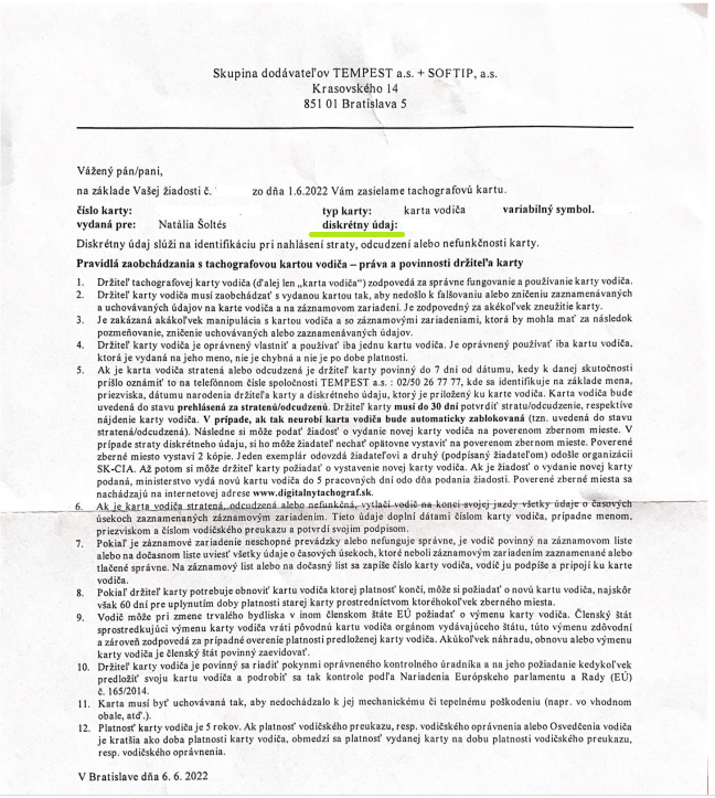 Ak ste odvážni a idete to riešiť online, potrebujete diskrétny údaj, ktorý nájdete v sprievodnom liste k tachografovej karte. Naozaj to tam je. Peťo má svoje tlačivo z r. 2019 a diskrétny údaj tam má. Ak ste si toto tlačivo neodložili a nemáte ho doma, máte smolu. Ak ste ho práve našli, tak si to viete online obnoviť cez túto stránku.