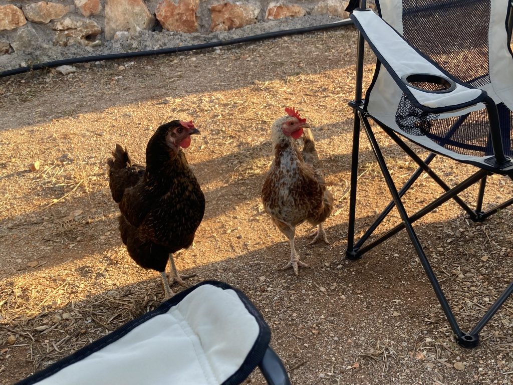 Na Lefkade sme našli veľmi pekný kemp (Camper Stop Lefkas), ktorý otvorili len nedávno. Domáci tam mali sliepku a inú hydinu, ktorá sa voľne túlala po kempe. Takže pri raňajkách nám často robili spoločnosť.
