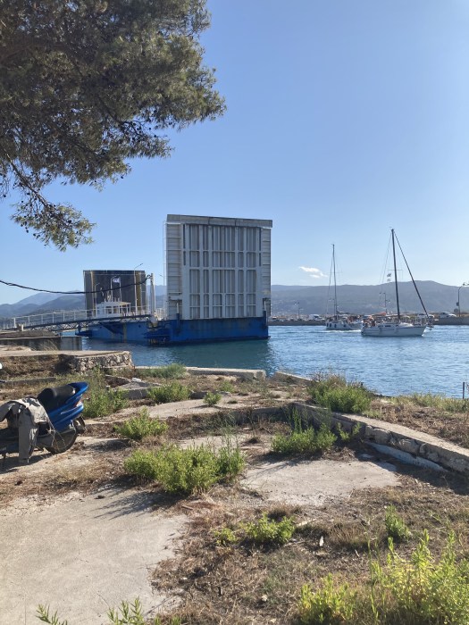 Na ostrov sa zo Solúna dostanete diaľnicou. Samotný ostrov s pevninou spája päťdesiat metrový zdvíhací most, ktorý sa každú hodinu presne o celej zdvihne, aby cez neho mohli preplávať lode. Viac na fotografiách nižšie.
