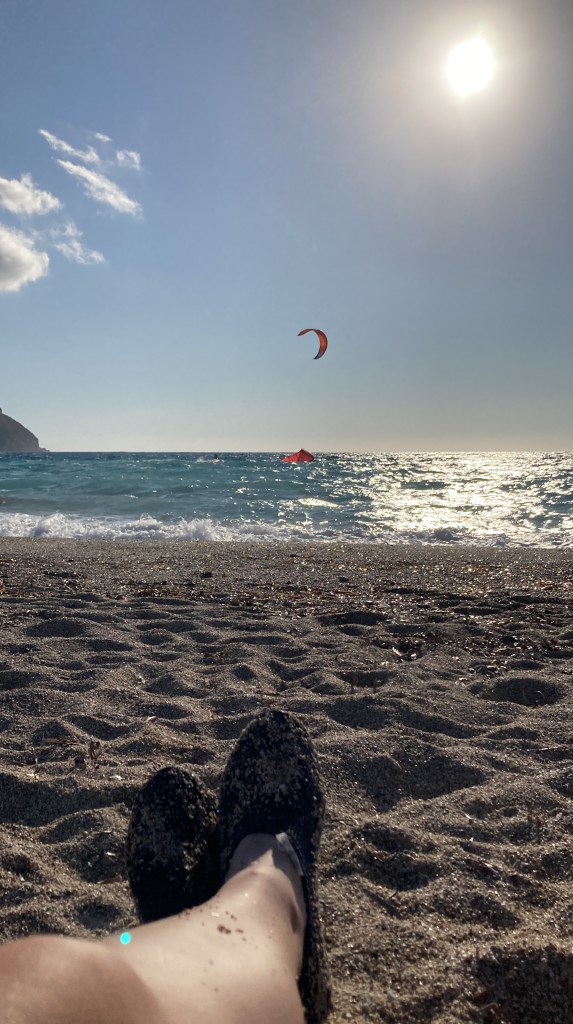 Tu sme si konečne oddýchli. Pri mori na Lefkade sme boli len jeden deň, tam to bolo síce voľnejšie, boli sme na konci, kde už neoficiálne začínala nudistická pláž, mali sme vlastnú deku a prístrešok, no aj tak ma tam neskutočne spálilo. Tu to bolo oveľa lepšie.