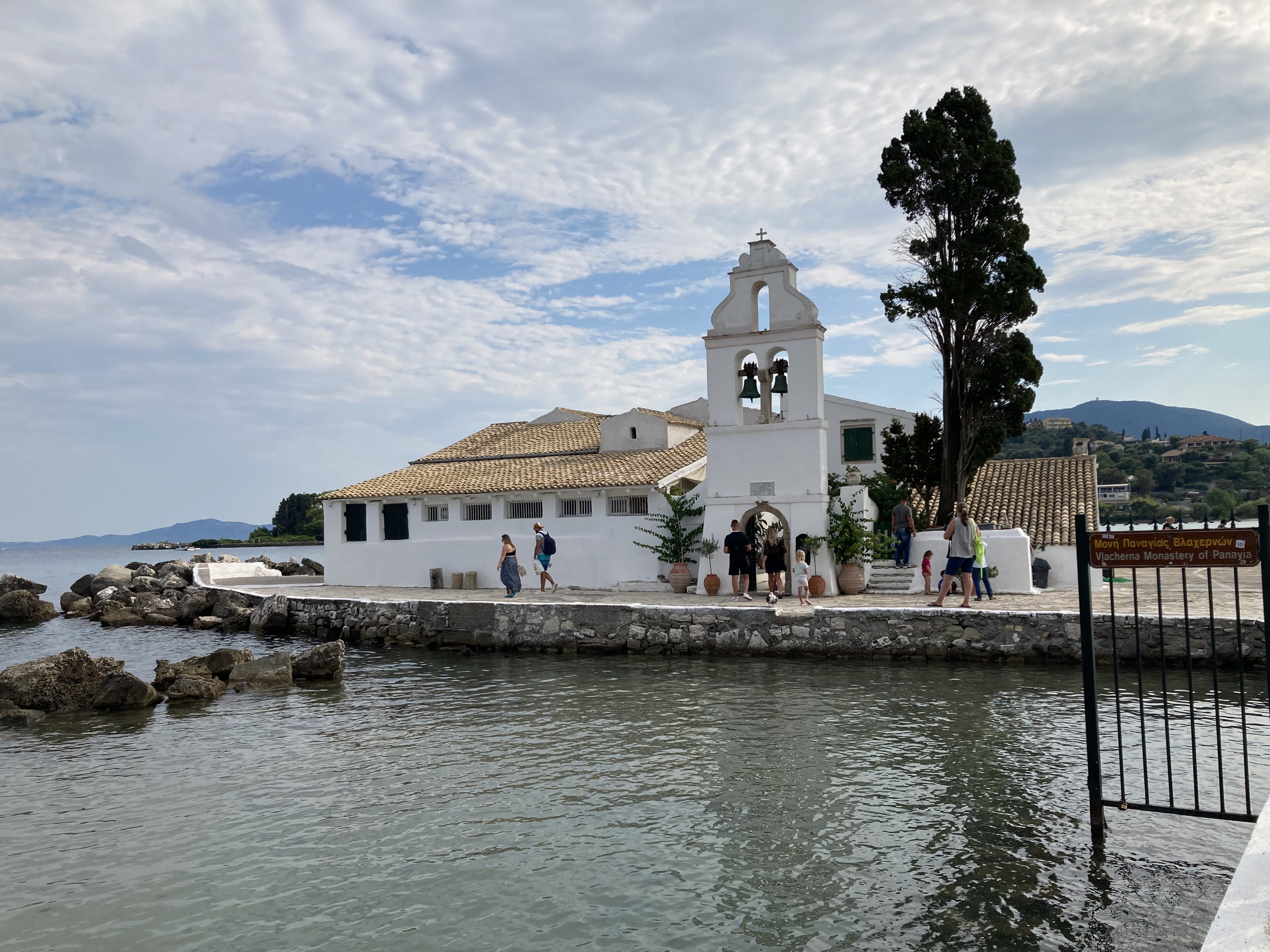 Kotvia tam lode, ktoré vás odvezú na Pontikonisi inak aj Myšací ostrov, ktorého súčasťou je pravoslávny kostol Holy Church of the Transfiguration of the Savior.