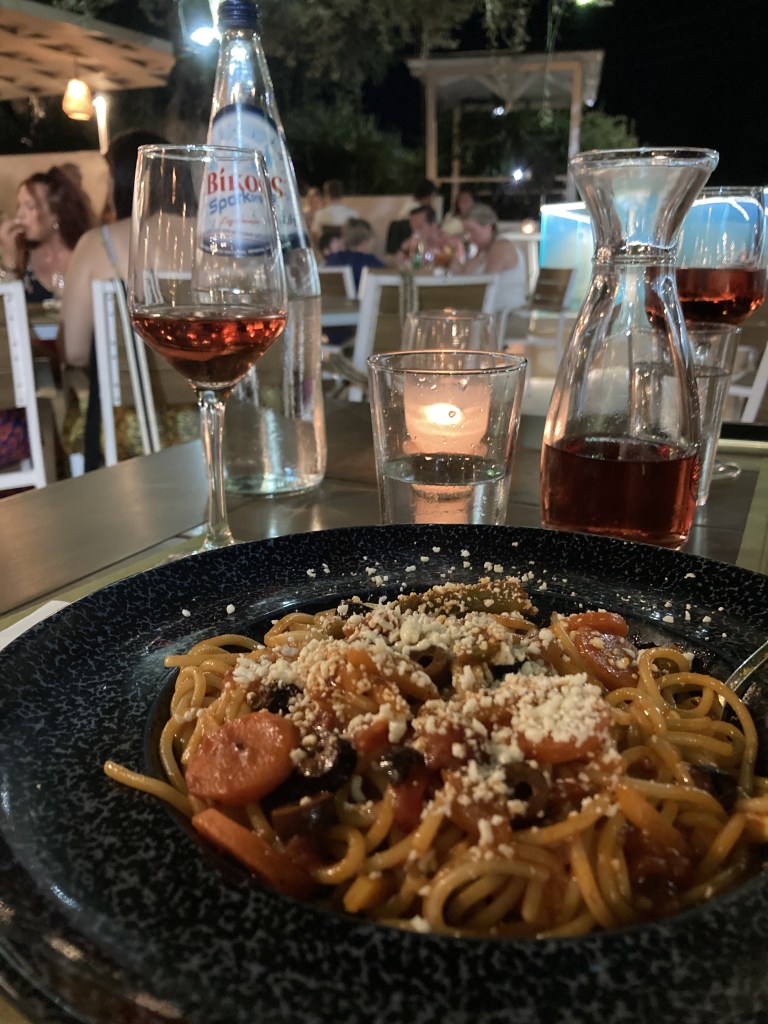 Na recepcii po úspešnej registrácii nás pani majiteľka pozvala na nedalekú pláž Agios Spiridon, kde mali večer začať slávnosti s bohatým programom. Neváhali sme a po úspešnom zakempení sme šli tam. Ešte sme stihli zaparkovať a prešli sme sa do nedalekej talianskej reštaurácie, kde sme si dali na večeru výborné cestoviny, pretože sme mali čas, kým sa program začne.