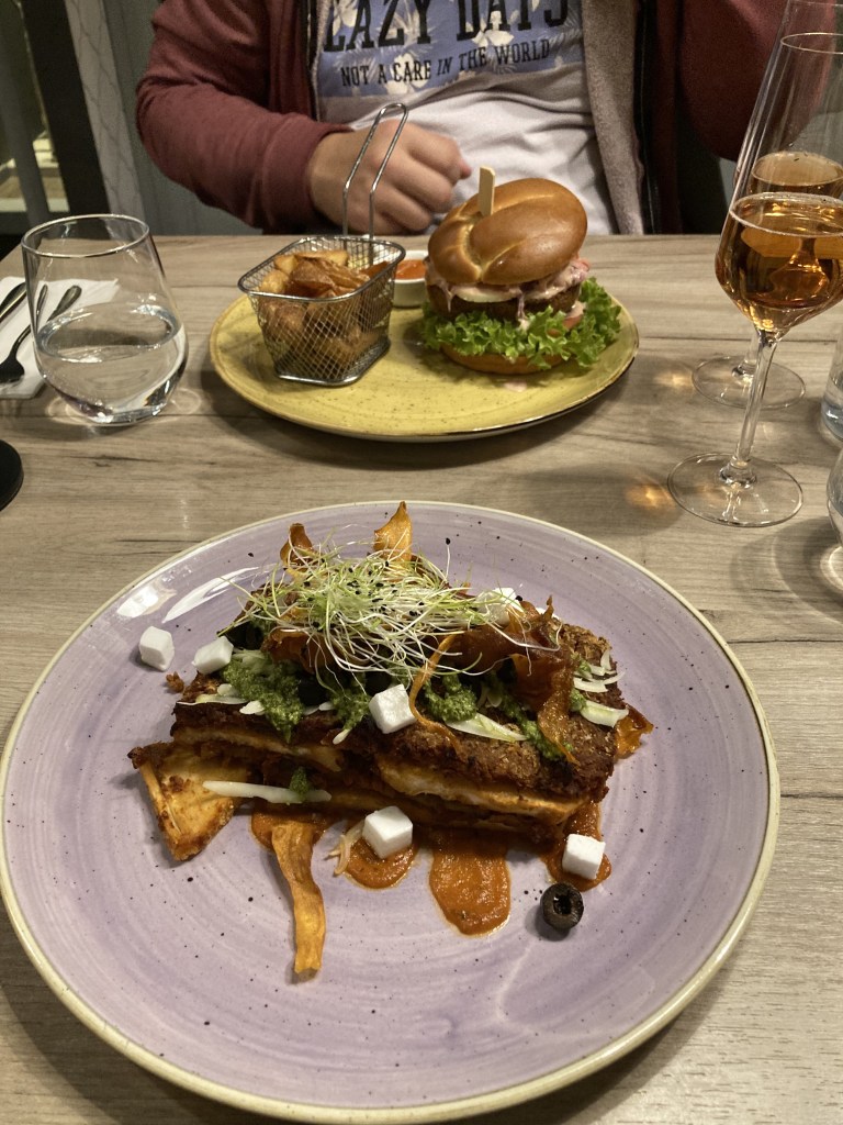 Po návšteve múzea sme sa presunuli do centra na večeru do vegánskej reštaurácie s názvom MANNA 68, kde sme sa dostali k stolu bez rezervácie; iní takéto šťastie nemali. Mali naozaj plno. V rámci sezóny sme si všimli, že každá dobrá reštaurácia mala rad čakajúcich ľudí pred vstupom. K večeri sme si dali prvýkrát nealkoholické víno.